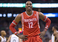 Rockets center Dwight Howard reacts to a foul call in the first half of a game against the Houston Rockets on Saturday, Nov. 2, 2013, at EnergySolutions Arena in Salt Lake City.