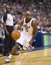 Jazz guard John Lucas III drives to the basket in the first half of a game against the Hou