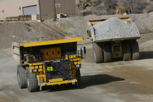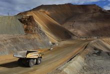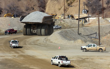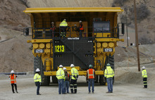 The 320 ton trucks at Kennecott have been the backbone of remediation efforts at Kennecott. Nearly 6-months ahead of schedule, top-to-bottom access within the Bingham Canyon Mine returns with the opening of Kennecott's new 150 ft wide mine access ramp. On Wednesday, Nov. 6, 2013, mine operators granted access to see the progress that has been made with 14 million tons of material removed so far following the 150 million ton slide that shut down operations for 17 days, seen in background.
