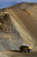 A 320-ton truck, which has been the backbone of remediation efforts at Kennecott, casts a long shadow. Nearly six months ahead of schedule, top-to-bottom access within the Bingham Canyon Mine returns with the opening of Kennecott's new 150-foot-wide mine access ramp. On Wednesday, Nov. 6, 2013, mine operators granted access to see the progress that has been made with 14 million tons of material removed so far following the 150 million ton slide that occurred April 10.