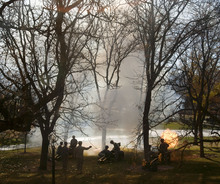 Tents and chairs surrounded Taylorsville's permanent veterans' plaza, where bronze statues and patriotic sayings honor those who have served.