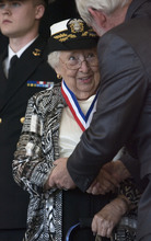 High school ROTC cadets, beauty queens and veterans' groups marched past the five flags honoring the Army, Navy, Air Force, Marines and Coast Guard and monuments standing in the midst of a permanent rose garden in front of City Hall.