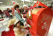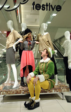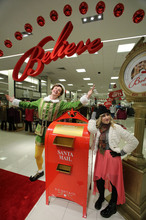 The character's pointed green cap and black boots with curly toes make VanAntwerp look even taller than his 6-foot-4-inch height. Even if his thick yellow tights don't quite cover a tattoo on the 27-year-old Northern California native's leg, you'd never guess that he would rather be anywhere else than gallivanting through the mostly empty store with child elves. The actor smiles as he gracefully lifts Jovie under a sparkly sign that reads "Believe," pausing for the trailing photographers to capture the shot.