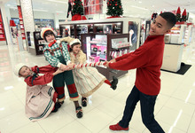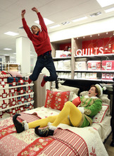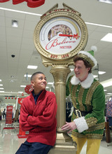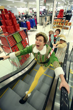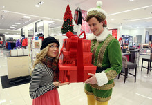 Now the cast has threaded through most of the store's departments, re-creating scenes from "Elf" while pretending to send letters to Santa and to jump on the store's pretend beds. As he's walking out of the store, VanAntwerp is talking about the nostalgic tone of the musical, but then another idea occurs to the big elf. "We should have a shot of a [store] security guard throwing me out of the store," VanAntwerp says. "That's funny."
