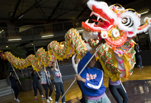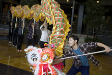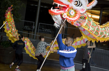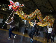 Stephen Nakagawa and other dancers from Ballet West 2 rehearse with a 36-foot dragon at Trolley Square in Salt Lake City, Nov. 20, 2013. The dragon is s a new element in a Chinese variation of this season's production of "The Nutcracker."