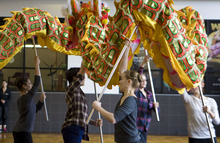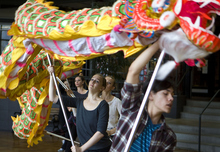 Stephen Nakagawa and other dancers from Ballet West 2 rehearse with a 36-foot dragon at Tro