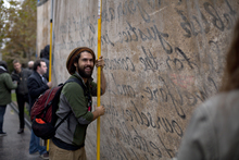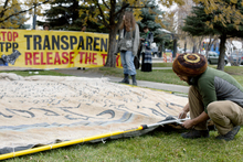 Watched over by a small contingent of Salt Lake City police and other security officers, demonstrators carried various signs on the lawn and sidewalk in front of the hotel. Among them: "Protect Us From Corporate Protectionism," "Obama: Exorcise Your Corporate Demons" and "Mormon Environmental Stewardship Alliance."