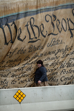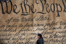 One group held a U.S. flag, with the stars replaced by corporate logos such as those for McDonald's, CBS, Coca-Cola and Microsoft.