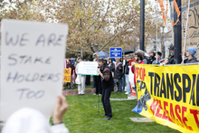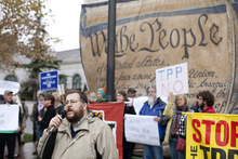 Tuesday's rally, organized by a coalition called the Citizens Trade Campaign, of Washington, D.C., drew 100 or so protesters, who allege that the high-level talks have been conducted behind closed doors with only multinational corporations given access to proposed provisions.