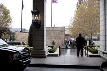 Outside Salt Lake City's Grand America Hotel on Tuesday, the rains fell, the speakers rose, the marchers chanted.