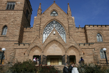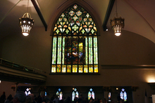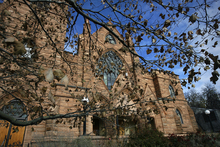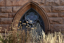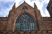 Features • Large stained-glass windows, oak pews, indigenous red sandstone exterior, elaborate pipe organ