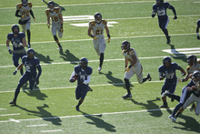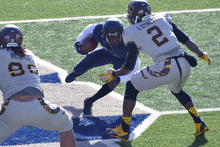 Eventually, the Aggies attack was able to help itself. DeMartino had 112 yards and a score on the ground that put Utah State up 21-0 at halftime. Darrel Garretson, after throwing for Utah State's first touchdown of the day, had an efficient 20-for-29 day with 156 yards and two more scoring passes.