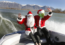 With water spray kicking up like snow, Santa and the Grinch (Keith Morgan and John Lohner), get waves from the crowd that came to see them water ski for a good cause. The public was invited to watch and bring a canned food item to donate to the Utah Food Bank, as they waterski on Utah Lake, Saturday November 30, 2013.