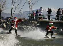 Santa and the Grinch (Keith Morgan and John Lohner), wave to the crowd prior to water skiing for a good cause. They invited the public to watch and bring a canned food item to donate to the Utah Food Bank, as they waterski on Utah Lake, Saturday November 30, 2013.