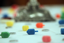 Colorful dradles decorate the table holding the menorah at the menorah-lighting ceremony at