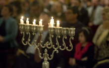 Colorful dradles decorate the table holding the menorah at the menorah-lighting ceremony at the Governor's Mansion, December 2, 2013 in Salt Lake City. Community and religious leaders representing many faiths were present for the event.