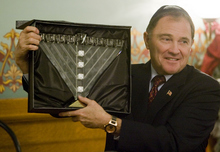 Utah Governor Gary Herbert holds a crystal menorah presented to him by Rabbi Benny Zippel o
