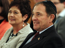 Utah governor Gary Herbert and his wife Jeanette attend the menorah-lighting ceremony at the Governor's Mansion, December 2, 2013 in Salt Lake City. Community and religious leaders representing many faiths were present for the event.