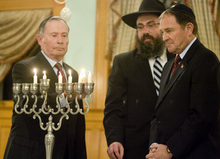 Utah Governor Gary Herbert, right, and Rabbi Benny Zippel of Chabad Lubavitch of Utah watch as former U.S. Ambassador John Price, whose family fled Nazi Germany when he was 5 years old, lights the menorh during the menorah-lighting ceremony at the Governor's Mansion, December 2, 2013 in Salt Lake City. Community and religious leaders representing many faiths were present for the event.