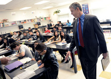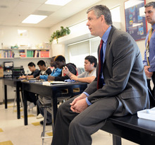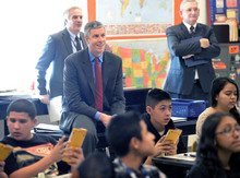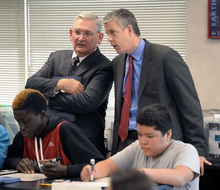 Utah State Superintendent of Schools Martel Menlove, left, and Secretary of Education Arne Duncan observe students work through a problem in Roger Haglund's 8th grade math class at Northwest Middle School in Salt Lake City Thursday Dec. 5, 2013. In 2010 the school got a $2.3 million federal School Improvement Grant. Such grants target Title I schools with high populations of impoverished students. This school has shown dramatic improvement in academic performance over the three years.