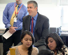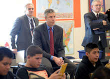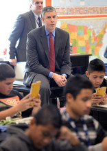 Education Secretary Arne Duncan observes students in Roger Haglund's 8th grade math class at Northwest Middle School in Salt Lake City Thursday Dec. 5, 2013. In 2010 the school got a $2.3 million federal School Improvement Grant. Such grants target Title I schools with high populations of impoverished students. This school has shown dramatic improvement in academic performance over the three years.