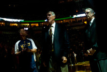 After a standing ovation from the crowd and a video display of old highlights, Sloan stood up from his usual seats in the arena and waved.