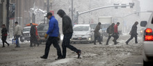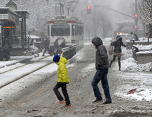 People slog and slide across Main Street in Salt Lake City during the heavy, wet snow falli