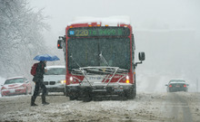 A pedestrian crosses 1300 East at 200 South as a snowstorm snarled commuter traffic in S