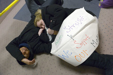 A couple declares their straight status with "we are straight & we support our mom" as they sleep amongs the hundreds of same-sex couples who descended on county clerk offices around the state of Utah on Monday, Dec. 22, 2013, including the Salt Lake County office to request marriage licenses. A federal judge in struck down the state's ban on same-sex marriage last Friday, saying the law violates the U.S. Constitution's guarantees of equal protection and due process.