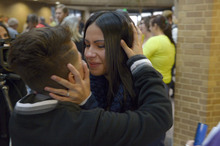 Angela Marinez, left, embraces her wife Monique Lobato in a kiss after being married in the lobby of the Salt Lake County offices on Monday, Dec. 23, 2013. A federal judge in Utah struck down the state's ban on same-sex marriage last Friday, saying the law violates the U.S. Constitution's guarantees of equal protection and due process.