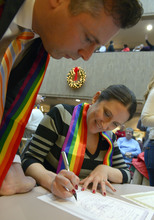 Jim Tabery and his wife Dawn-Marie Tabery take special care to fill out a marriage certificate for a gay couple as the two joined many more officiants at the Salt Lake County offices on Monday, Dec. 23, 2013. A federal judge in Utah struck down the state's ban on same-sex marriage last Friday, saying the law violates the U.S. Constitution's guarantees of equal protection and due process.