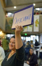 Allison Ottley makes her services knows as hundreds of same-sex couples descend on county clerk offices around the state of Utah on Monday, Dec. 22, 2013, including the Salt Lake County office to request marriage licenses. A federal judge in struck down the state's ban on same-sex marriage last Friday, saying the law violates the U.S. Constitution's guarantees of equal protection and due process.