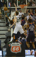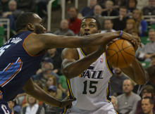 Utah Jazz power forward Derrick Favors (15) scores overCharlotte Bobcats power forward Josh McRoberts (11), in NBA action, Utah Jazz vs. The Charlotte Hornets, at the EnergySolutions Arena, Monday, December 30, 2013.,
