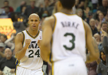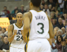 Utah Jazz small forward Richard Jefferson (24) greets Utah Jazz point guard Trey Burke (3) af