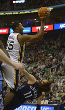 Utah Jazz power forward Derrick Favors (15) scores overCharlotte Bobcats power forward Josh M