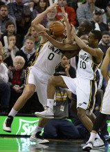 Utah Jazz center Enes Kanter (0) and Utah Jazz point guard Alec Burks (10) go for the ball along with Charlotte Bobcats center Bismack Biyombo (0) in NBA action, Utah Jazz vs. The Charlotte Hornets, at the EnergySolutions Arena, Monday, December 30, 2013.,