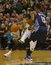 Utah Jazz center Enes Kanter (0) and Utah Jazz point guard Alec Burks (10) go for the ball al