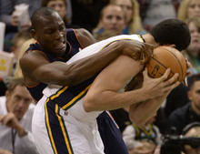 Charlotte Bobcats center Al Jefferson (25) checks out the scoreboard, as the Bobcats trail the Jazz, late in the game,in NBA action at the EnergySolutions Arena, Monday, December 30, 2013.,