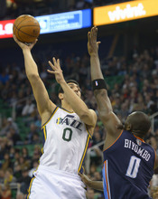 Utah Jazz center Enes Kanter (0) shoots overCharlotte Bobcats center Bismack Biyombo (0), in