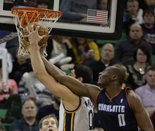 Utah Jazz small forward Jeremy Evans (40) goes to the hoop as Charlotte Bobcats power forward