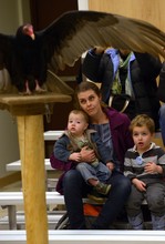 l-r Jenna Pike and her sons Emiliano,1, and Felix, 3, learn about "Miss Irvana" the Turkey Vulture and her environment during Tracy Aviary's program "Exploring Our Communitrees." The program teaches participants the hidden wonders of local trees up-close and personal, and provides a few nose-to-beak experiences with some of the native birds that call them home, Saturday, January 11, 2014