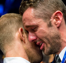 Tears run down Michael Ferguson's face as he and Seth Anderson take their first couple's da