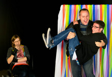 Elizabeth Pettit looks on as Mike Cramer and Brinton Valli pose for a photo booth photo at