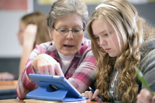 Jill Jackson, a math teacher for 25 years, helps seventh grader Emily Newell through a math problem on her iPad at Juab County Junior High in Nephi in December. The school has been phasing in a new interactive math curriculum.