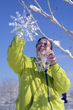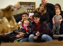 l-r Scott Hubka, son Benoit Hubka, 3, wife Virginie Dujols learn about "Storm" the Red-Tailed Hawk and its environment during Tracy Aviary's program "Exploring Our Communitrees." The program teaches participants the hidden wonders of local trees up-close and personal, and provides a few nose-to-beak experiences with some of the native birds that call them home, Saturday, January 11, 2014