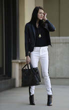 Wearing winter white pants with darker colors and patterns will diffuse the brightness of the white. Chapman suggests a leather jacket, bulky knit sweater or a flannel shirt and ankle boots to cool down the outfit. For an office-appropriate look, combine ivory trousers or tuxedo pants with a black or navy suit jacket. Choose heavier fabrics such as wool, denim, leather and suede. Save lightweight silk and linen trousers for spring and summer.