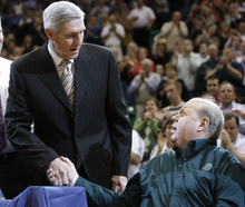 Utah Jazz head coach Jerry Sloan shakes hands with Utah Jazz owner Larry Miller as Sloan