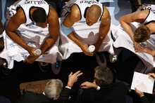 Utah Jazz coach Jerry Sloan talks to his players on the sidelines on his way to earning his 1000th career victory after the Jazz beat the Mavericks 101-79 in 2006.