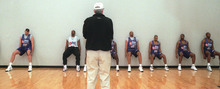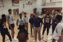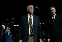 Former Utah Jazz head coach Jerry Sloan and assistant coach Phil Johnson (far left) li