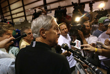 Utah Jazz head coach Jerry Sloan answers questions from reporters prior to Monday morning's practice at Factory of Champions Gym in San Antonio on May 21, 2007.